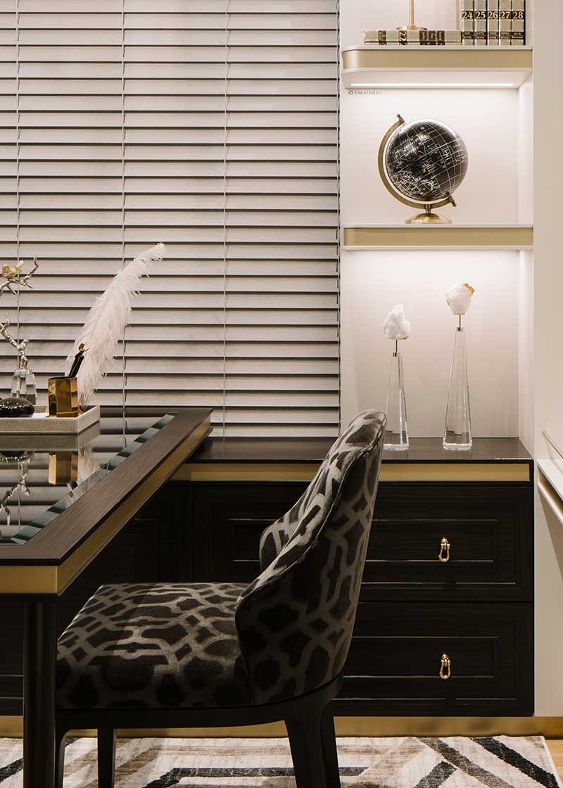 A palette of light ivory and taupe — highlighted with accents of gold and marble, and decorated with subtle